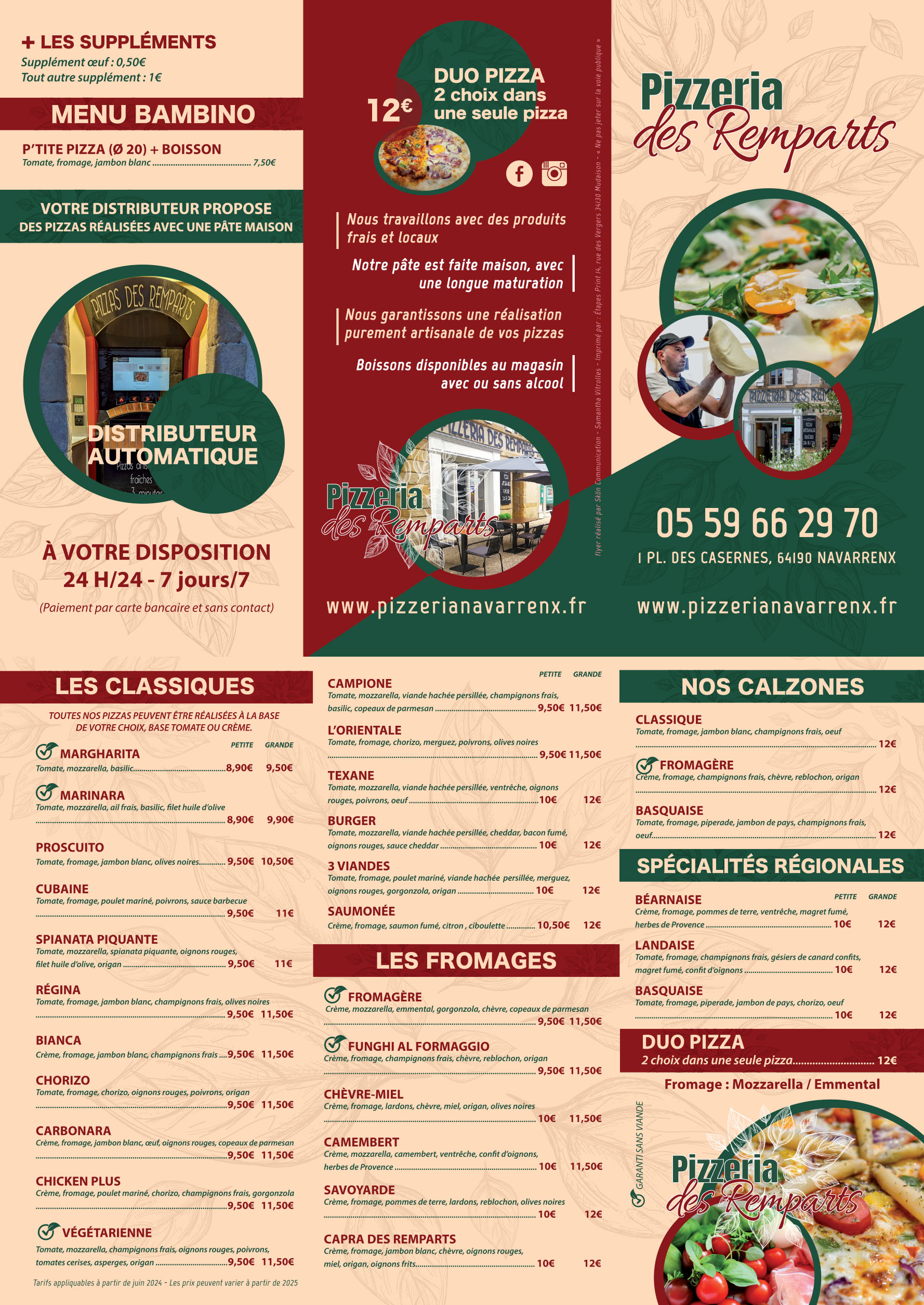 Outre les pizzas traditionnelles que nous proposons et que vous pouvez retrouver sur notre carte, vous découvrirez un monde de créativité et de savoir-faire culinaire avec nos spécialités uniques : les pizzas duos et la célèbre calzone, symboles de l’innovation et de l’authenticité qui font de la Pizzeria des Remparts une destination incontournable pour les amateurs de cuisine italienne.